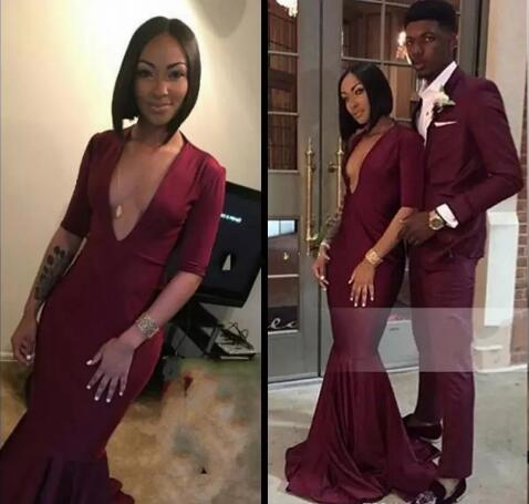 Sexy Mermaid Maroon Backless Evening Prom Dresses Long Deep V