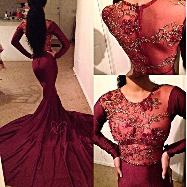 Custom Made Long Sleeves Maroon Prom Dress With Golden Top Maroon