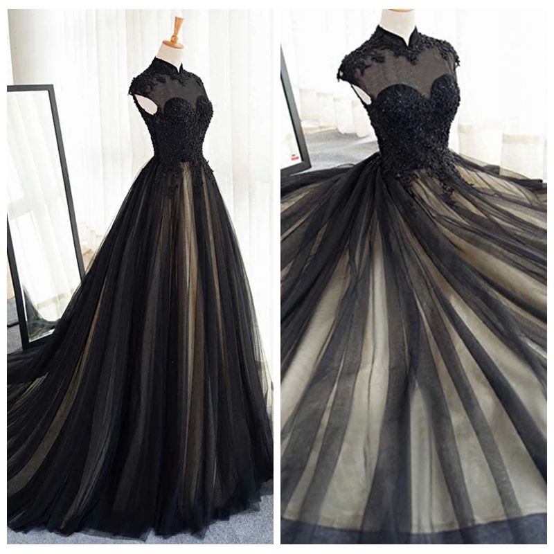Elegant High Neck Cap Sleeve A Line Tulle Long Black Prom Dresses
