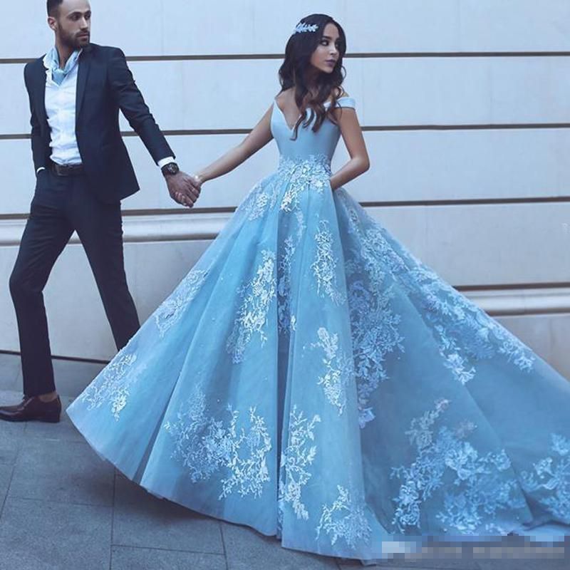 Off The Shoulder Lace Appliques Prom Dresses Baby Blue Cheap