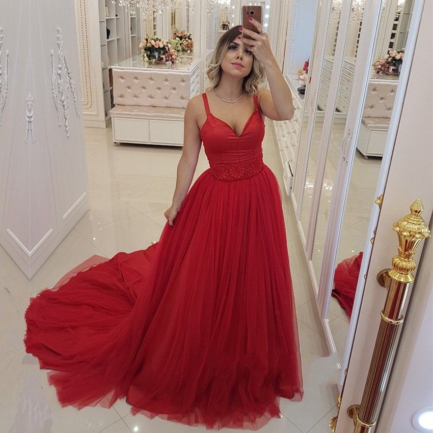 Chic Beautiful Red Prom Dresses 2019 A Line Princess V Neck