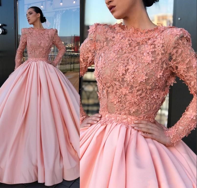 Long Sleeve Ball Gown Pink Prom Dress Appliques Pink Evening