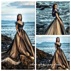 Black Lace Puffy Sleeved Off Shoulder Prom Ball Gown Lunss