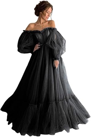 Off The Shoulder Evening Dress Black Prom Gown With Puffy Tulle