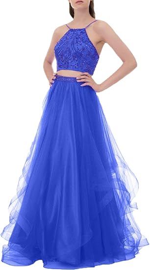 Huifany Women S Two Piece Prom Dresses Long Beaded Tulle Formal