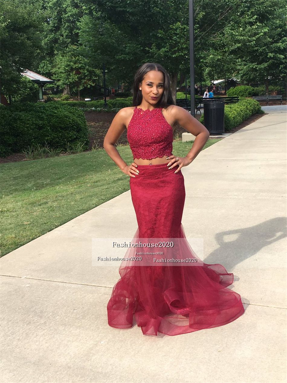 2020 African Style Burgundy Two Pieces Prom Dresses Mermaid Crew