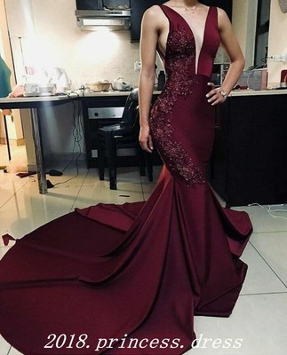 Sexy Mermaid V Neck Backless Burgundy And Black Long Prom Dress 2020