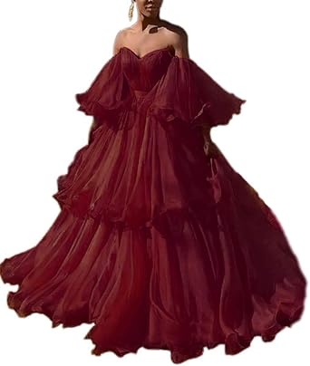 Burgundy Tulle Off Shoulder Long Prom Dress Burgundy Evening Dress