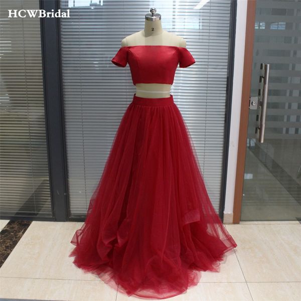 2019 Red Tulle Prom Dresses Short Sleeve A Line Floor Length