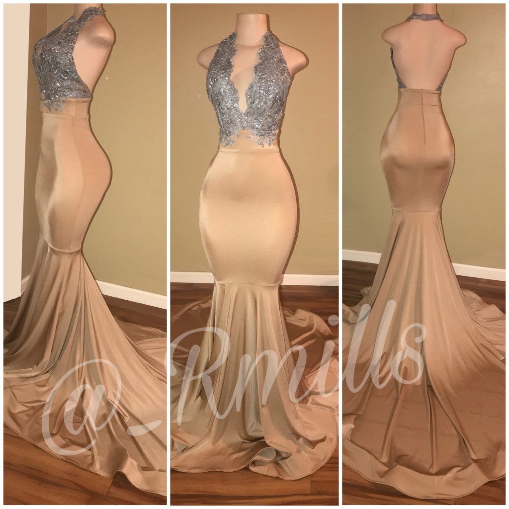 Sparkly Halter Champagne Lace Mermaid Prom Dress Lunss