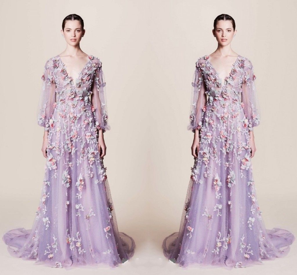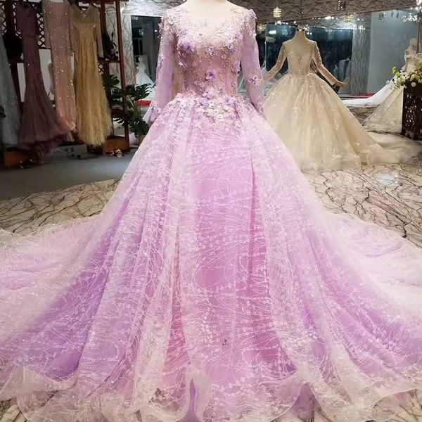 China Hand Sewn Flowers Long Sleeve Light Purple Gown Prom Dress