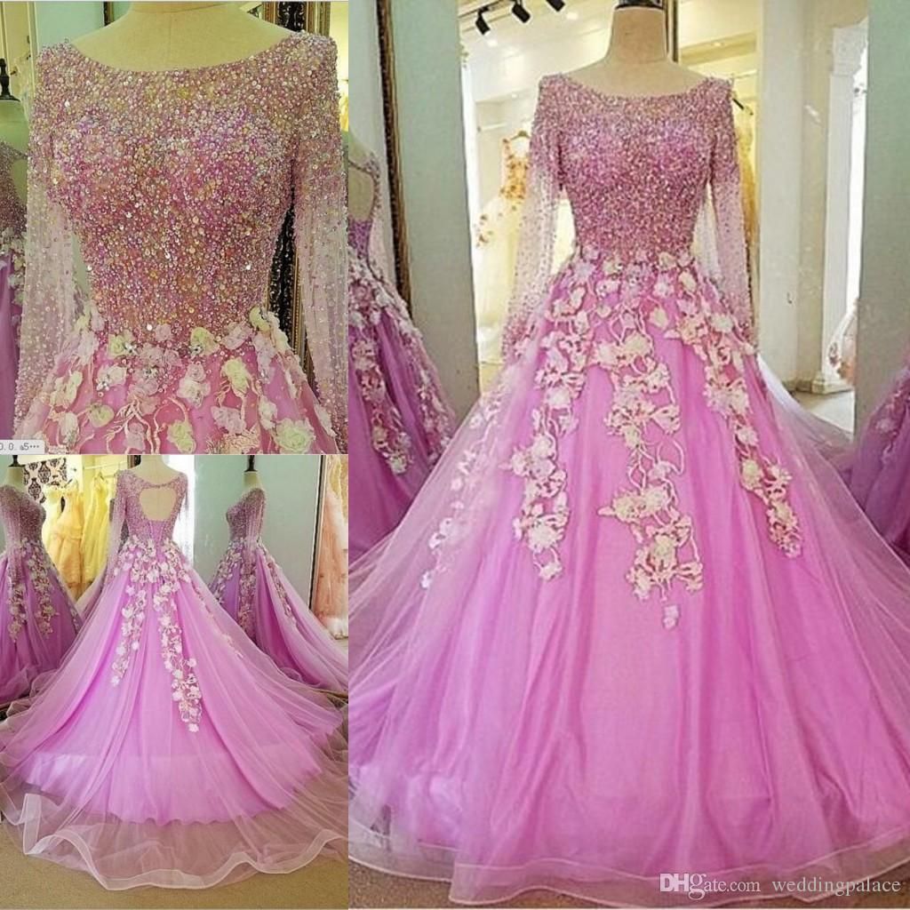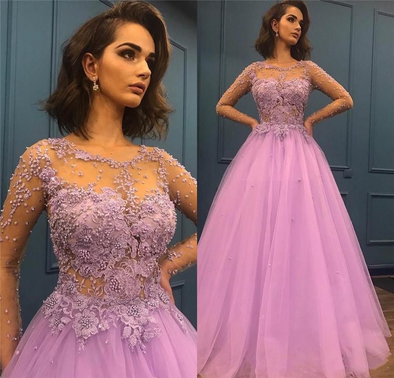 2019 Light Purple Evening Dresses Long O Neck Long Sleeves Flowers