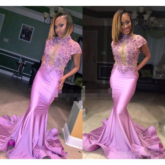 African Light Purple Prom Dresses Long 2019 High Neck Long Sleeves