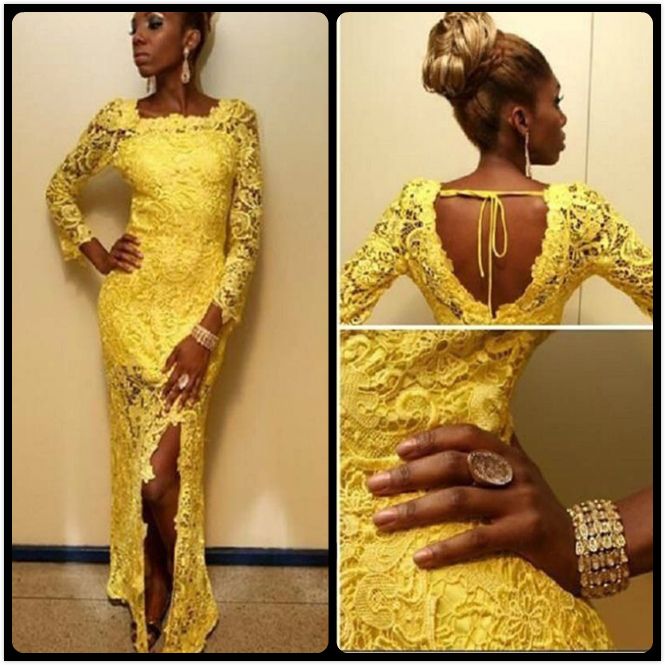 Nigerian Fashion Yellow Lace Prom Dress Scoop Long Sleeves Mermaid