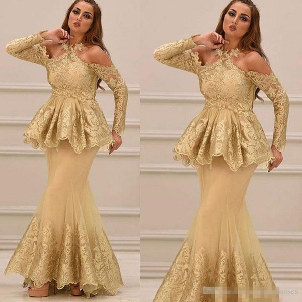 Yellow Prom Dresses Arabic Long Sleeve Lace Evening Dresses 2019