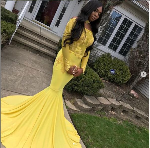 Yellow Long Sleeve Mermaid Prom Dresses 2019 New Lace Applique
