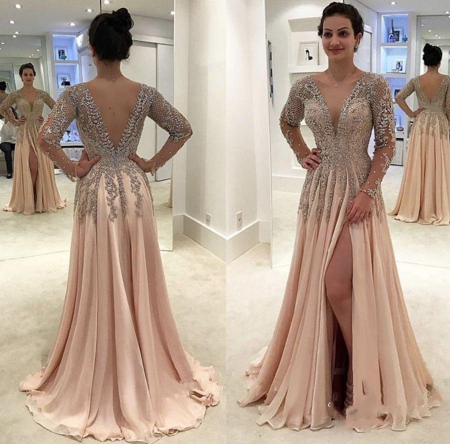 Long Sleeves Pale Pink Chiffon Long Prom Dress Sheer Top With Etsy