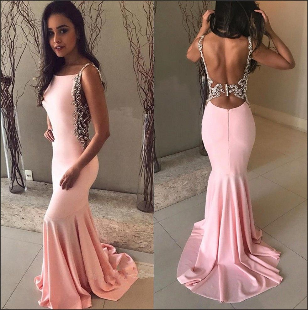 2018 Light Pink Satin Mermaid Long Prom Dresses Beaded Stones