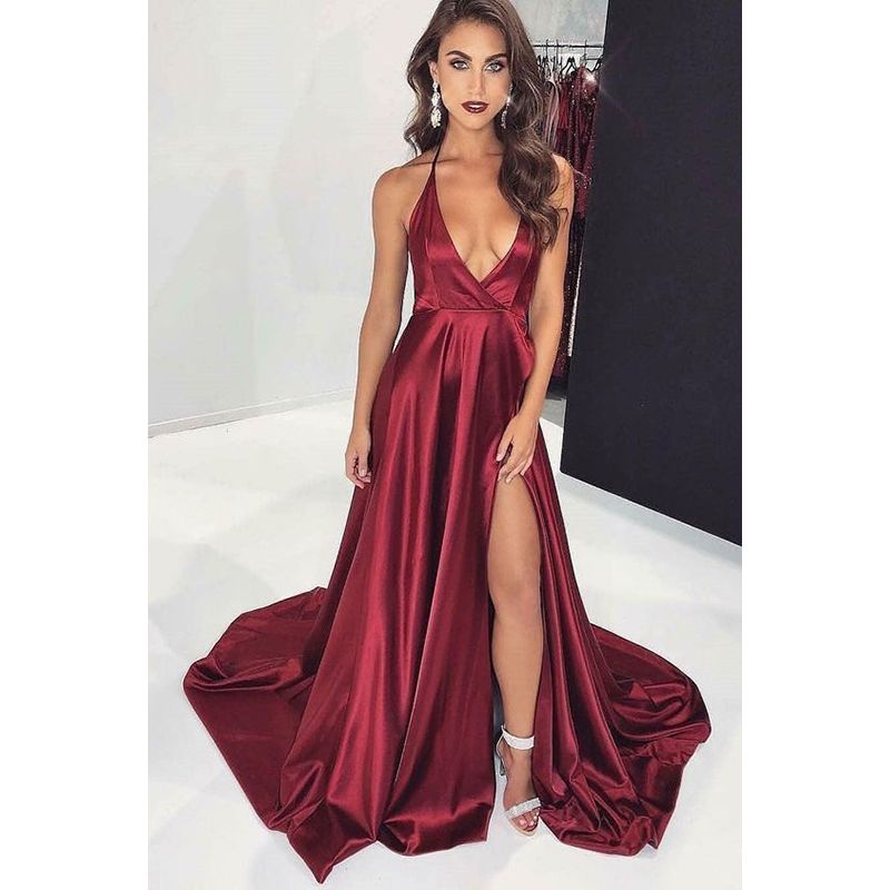 Simple Deep V Neck Elegant Long Prom Dresses 2019 Burgundy A Line