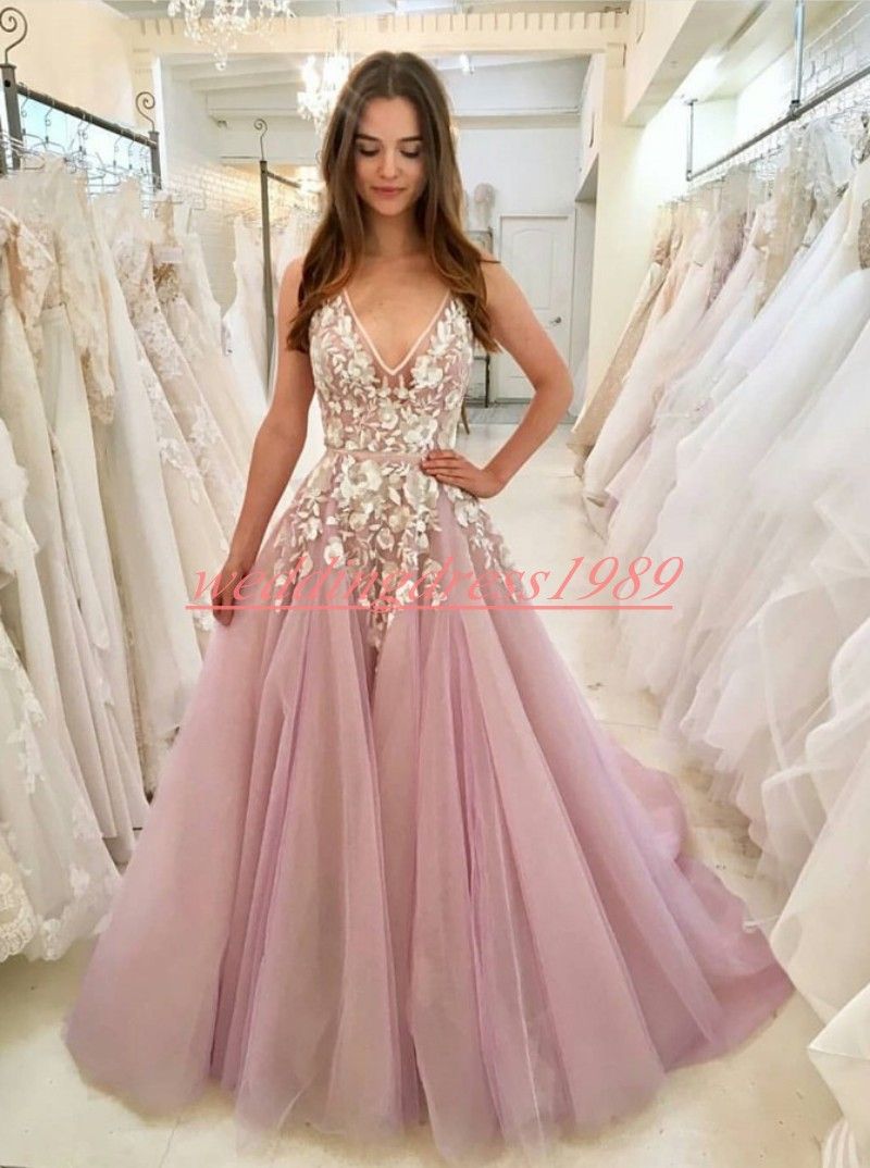 Pink Sleeves O Back With Applique Cute Tulle Long Prom Dress