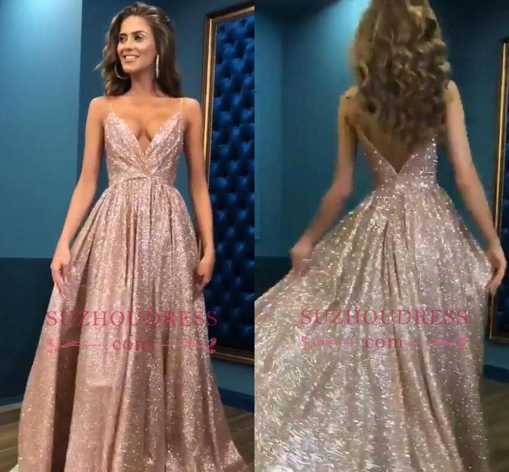 Glitter Rose Gold A Line Prom Dresses 2k20 Sparkly Spaghetti