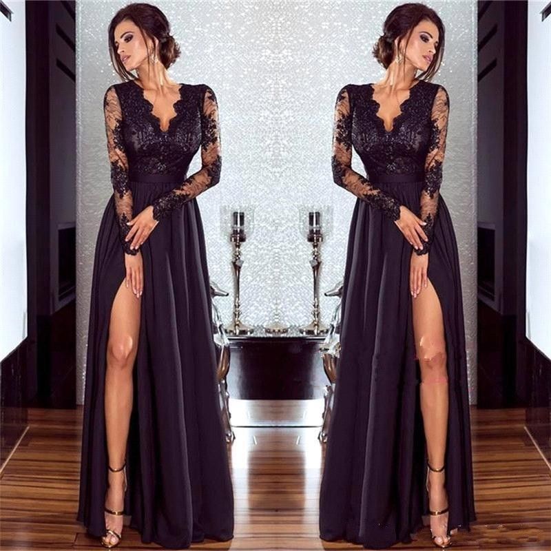 89 High School Prom Long Sleeve Lace Black Prom Dresses