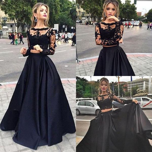 Two Piece Long Sleeves Black Satin Decent Prom Dress With Lace Top
