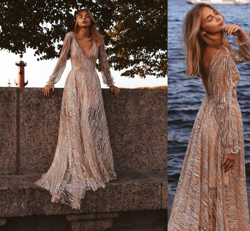 Prom Dress Silver Dress V Neck Plunge V Neck Long Sleeve Dress
