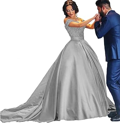 Glitter Grey Silver Ball Gown Princess Prom Dresses Lace Appliqued