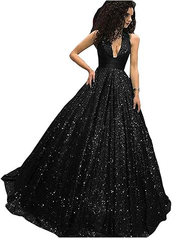 Halter V Neck Sequin Long Prom Dress Princess Pageant Ball Gown
