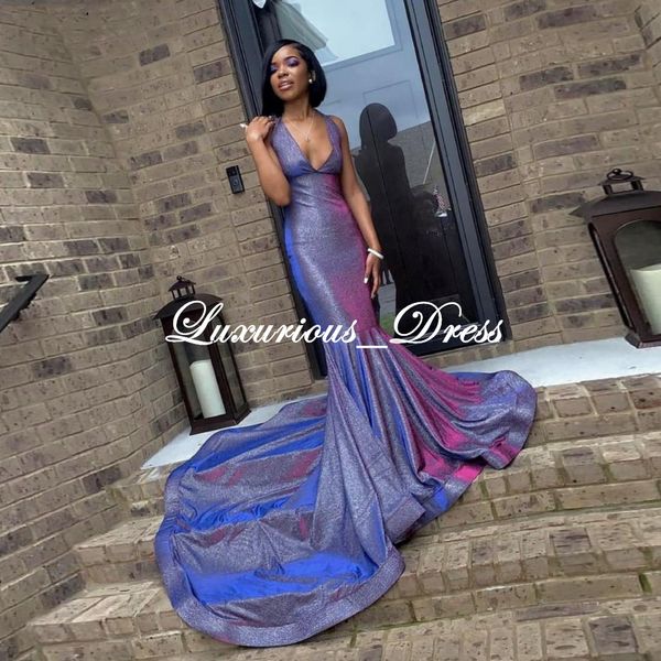2019 Sparkle Reflective Purple Sequined Prom Dresses Deep V Neck