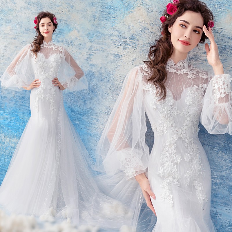 Po White Long Sleeve Mermaid Fishtail Wedding Bridal Prom Gown