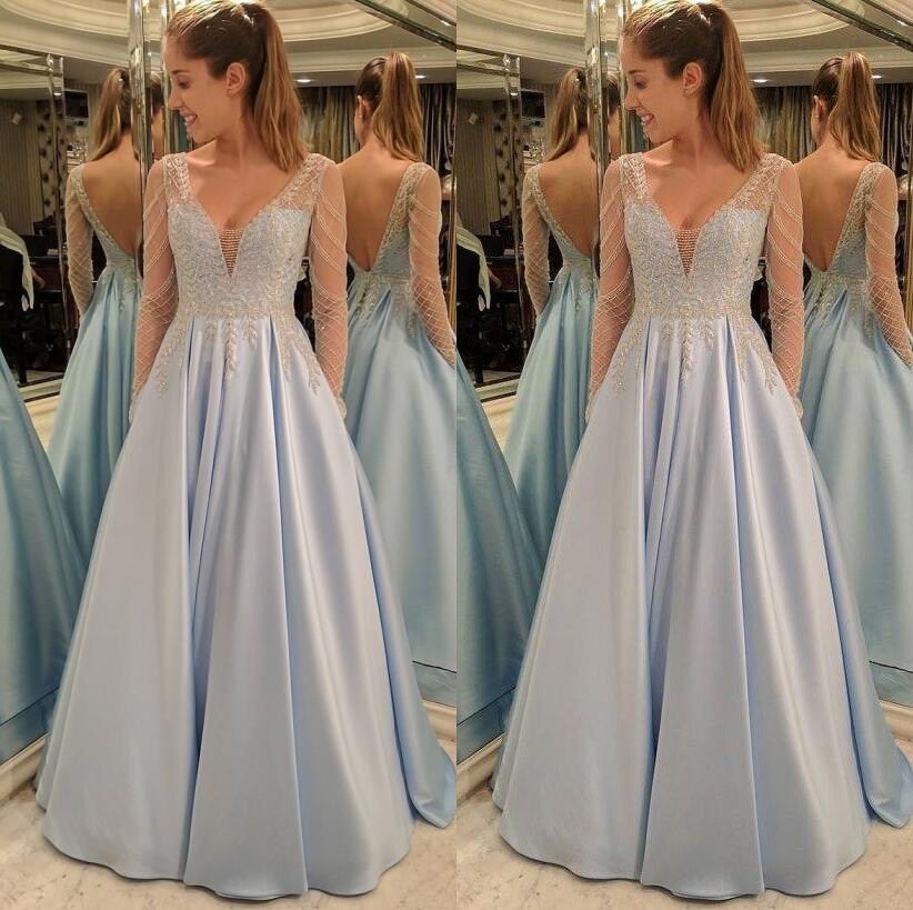 146 99 Light Sky Blue Long Prom Dresses 2019 A Line V Neck Long