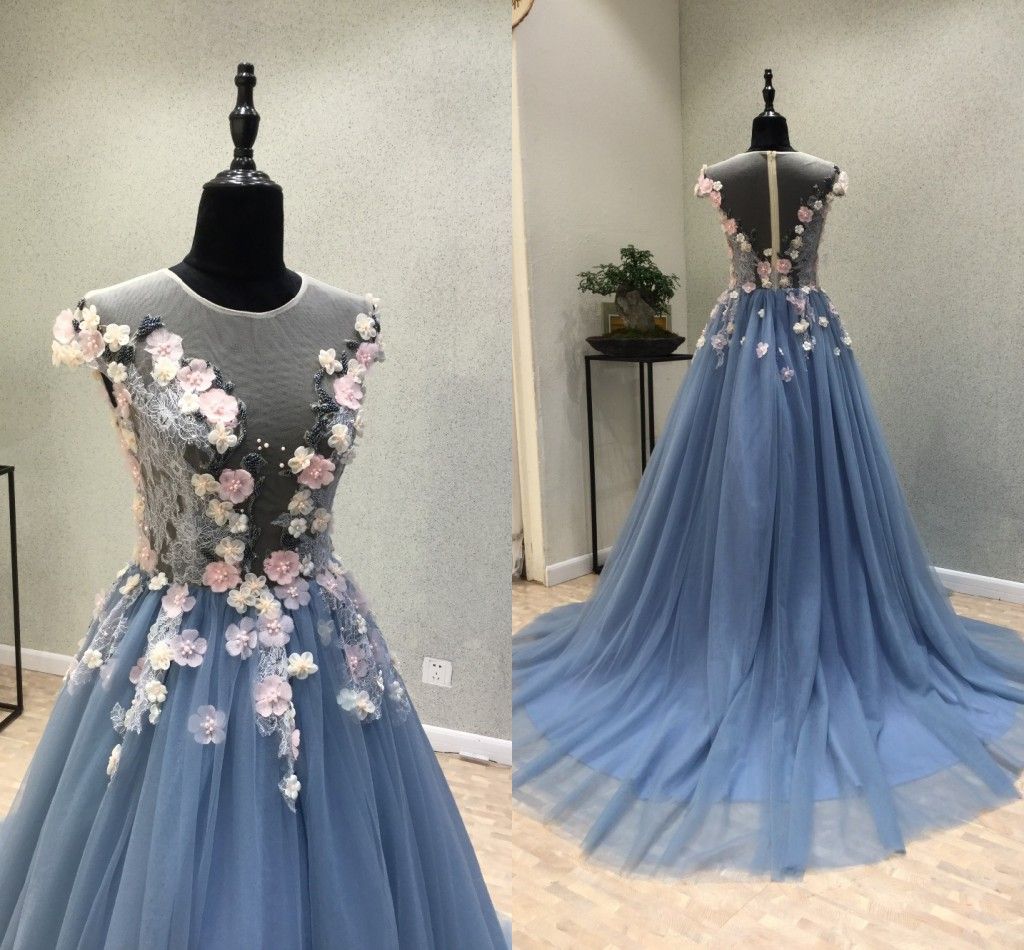 Blue Tulle Long Unique Prom Gowns Floral Appliqued Party Dresses