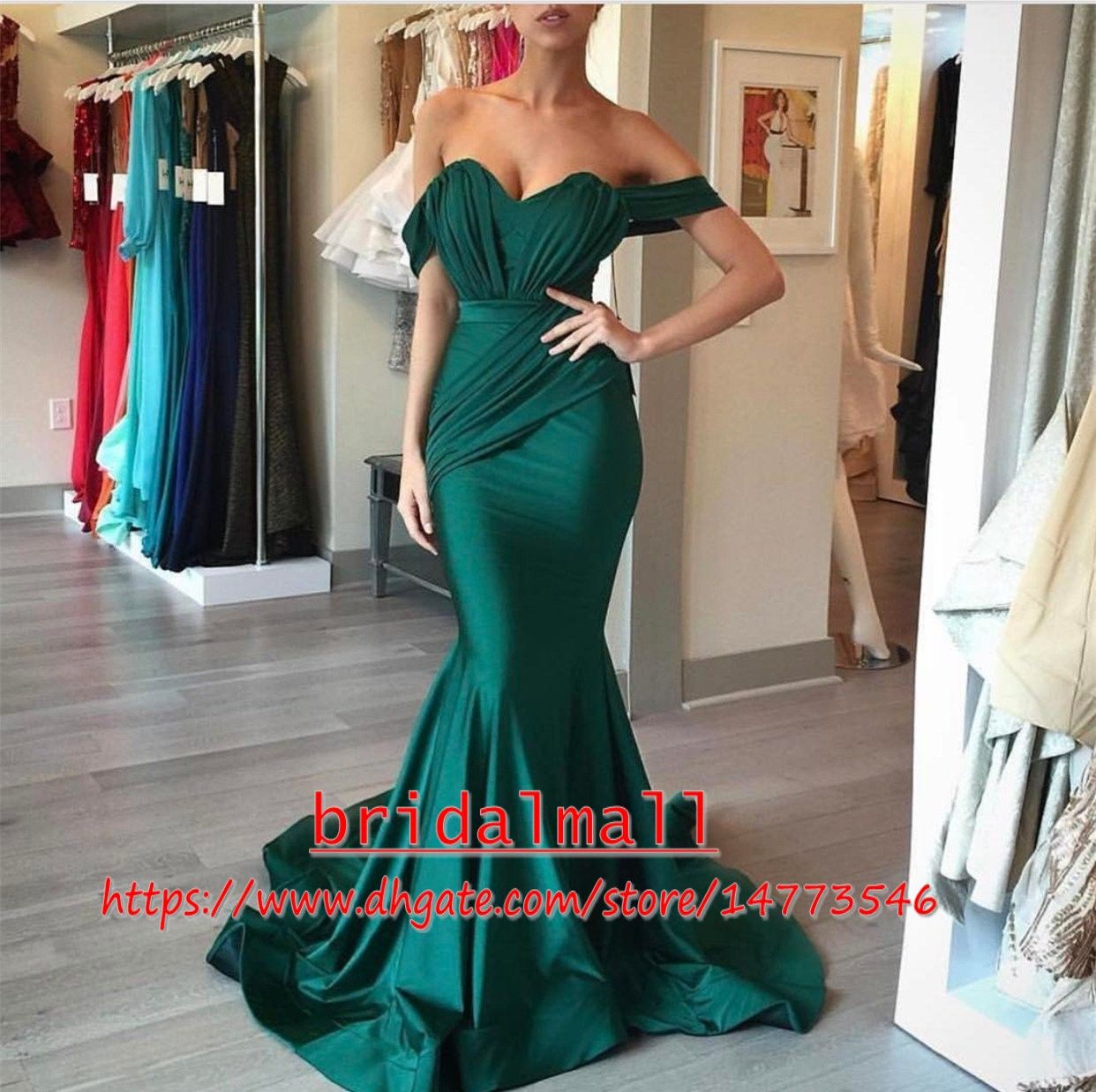 Off Shoulder Emerald Green Long Prom Dresses 2019 Sexy Pleats