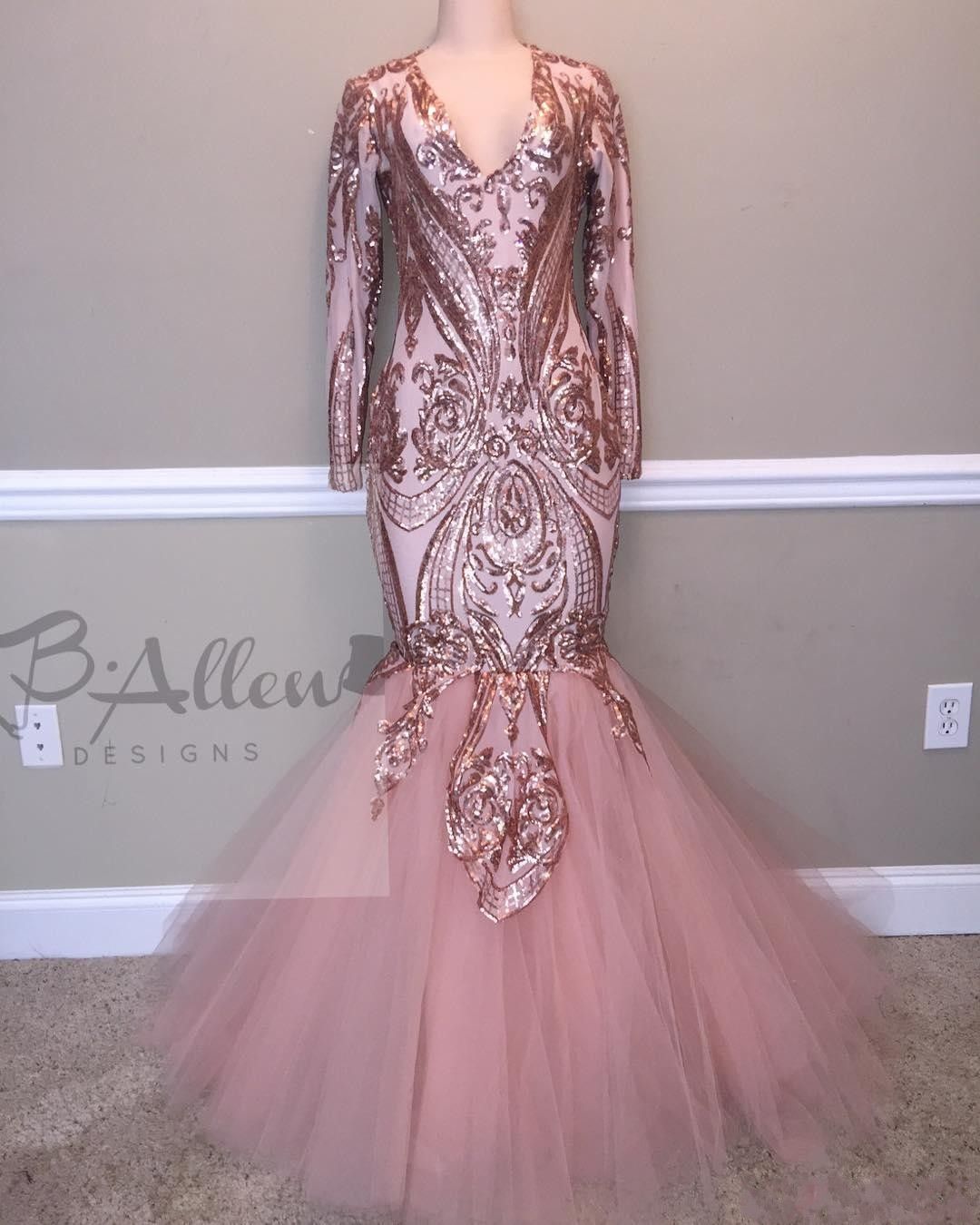 Sparkly Blush Pink Formal Prom Dresses 2019 V Neck Long Sleeve
