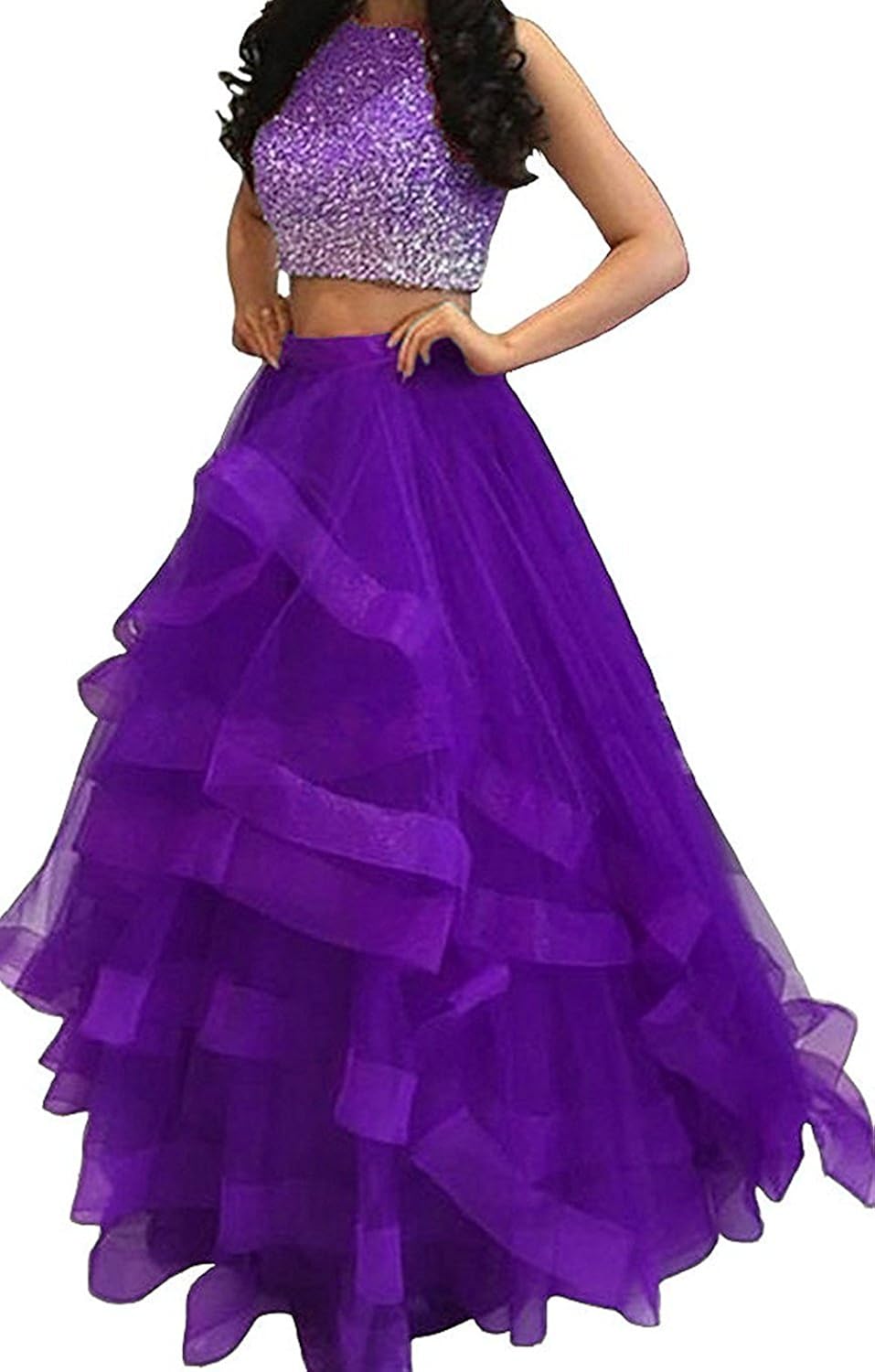 Purple Long Mermaid Beaded Prom Dresses Two Pieces Evening Dresses