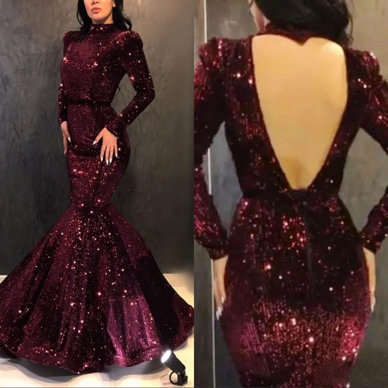 Sparkling Burgundy Long Sleeve Mermaid Prom Dresses 2019 High Neck