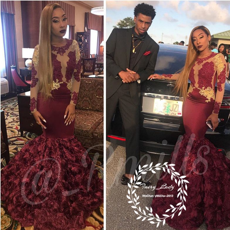 Burgundy Long Sleeve Mermaid Prom Dress African Gold Appliques
