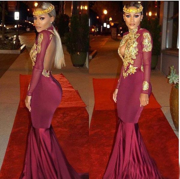 African Sexy Burgundy Long Sleeve Mermaid Prom Dress 2020 Gold