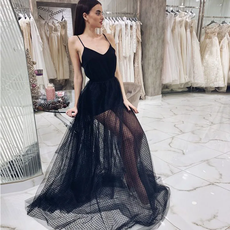 Black Prom Dress 2020 Sexy A Line Spaghetti Straps V Neck Tulle A