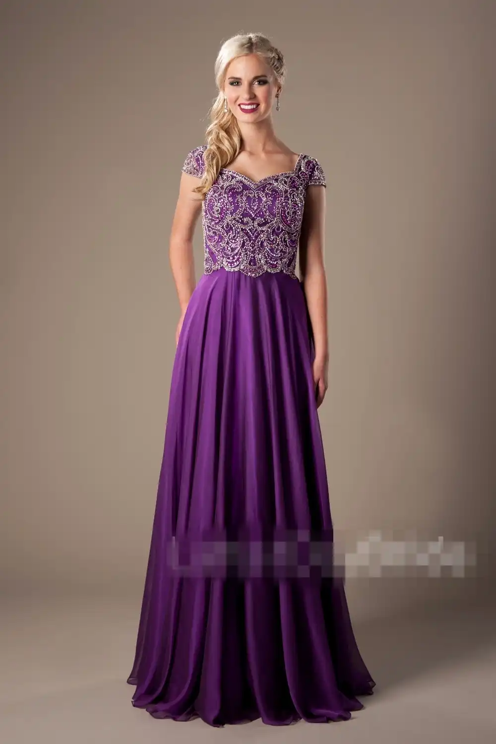 Sparkly Heavily Beaded Purple Long Modest Prom Dresses With Cap
