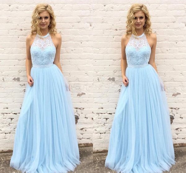Beauty Light Sky Blue Lace Tulle Prom Dresses Long 2018 Halter A