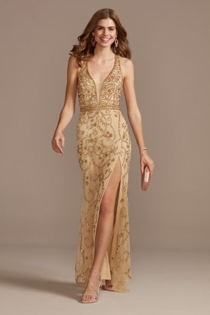 Prom Dresses Tight Fit Gold Mermaid Prom Dress Roses At The