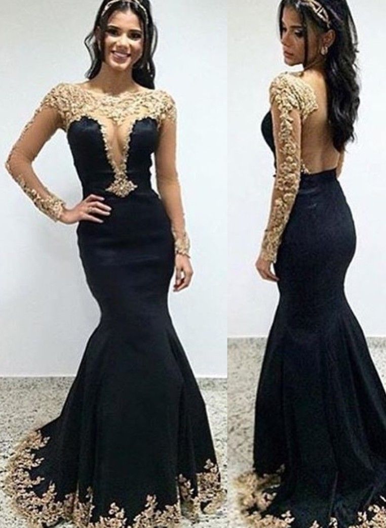Hot Black Long Sleeve Prom Dresses Mermaid Gold Lace Applique Open