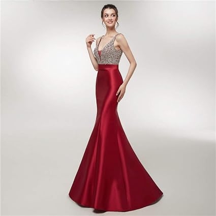 V Neck Mermaid Red Backless Prom Dresses Mermaid Red Backless