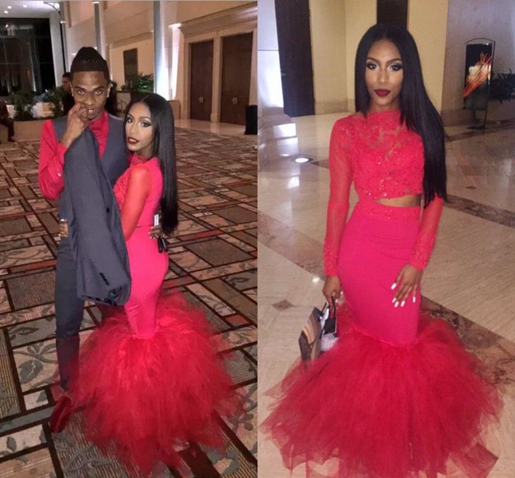 2020 Two Piece Mermaid Prom Dresses High Neck Long Sleeves Lace