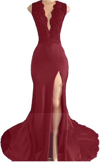 Sexy Mermaid Lace Open Back V Neck Side Split Long Prom Dresses
