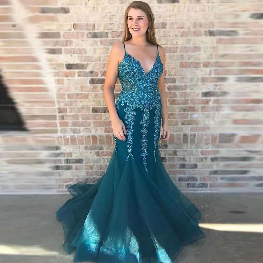 Elegant Teal Lace Mermaid Prom Gowns 2019 With Shiny Beads Sexy