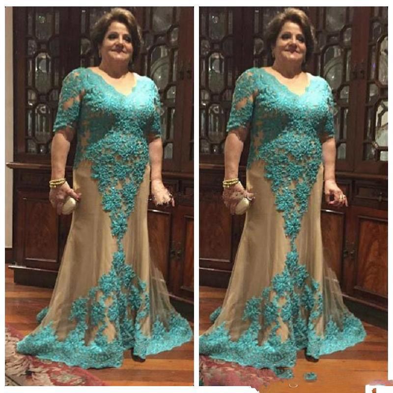 Teal V Neck Mother Prom Dresses Plus Size Lace Appliques Mermaid